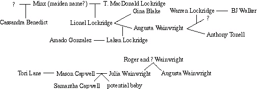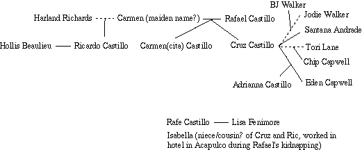 I am going to reformat this tree to make it more readable, so I'll add all the changes at that time. So far the correctons I've got are Pamela's maiden name is Peppridge, Rafe is Rafael's son from an affair with Isabel Secundo, Jeffrey's father's name Michael Conrad, and Hayley Benson is Gina's niece.