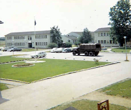 A view from the back balcony of the medic/commo barracks. the lush lawn is in front of battalion headquarters.