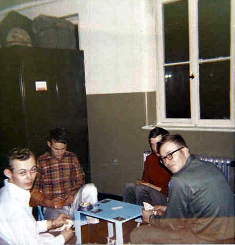 Poker game in medic platoon. Left to right: Gerald Mathias, Bob Braman, Ted Chase, Tim Selle.