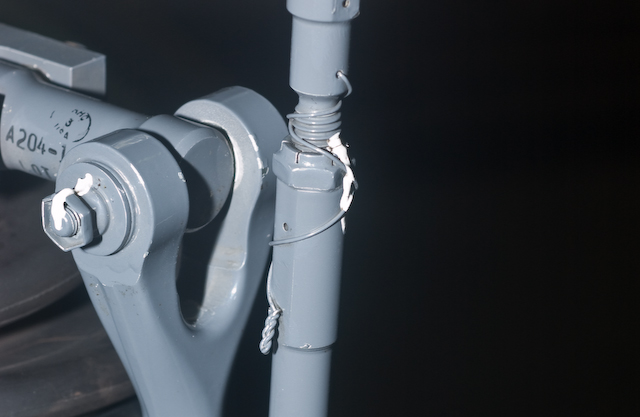 For each of the 3 main bolts, check that the cotter pin is present, the washer is not cracked, and the torque paint is intact.