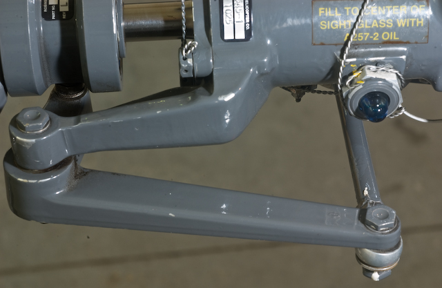 To check the tail rotor gearbox oil level, stand to the side and look sideways at the sight glass. You can see that the oil is blue, and you can see that the sight glass is about half full.