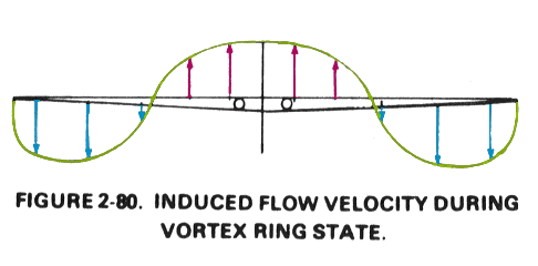 During the vortex ring state, roughness and loss of control is experienced because of the turbulent rotational flow on the blades and the unsteady shifting of the flow along the blade span.