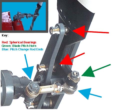 The bolt which goes through the "pitch horn" also goes through a pitch change rod end (right hand blue arrow) which has one of those spherical bearings in it. This allows the rod end to push and pull on the pitch horn, thereby changing the pitch of the blade.