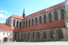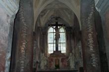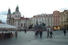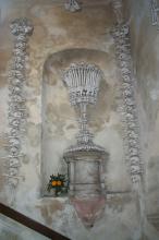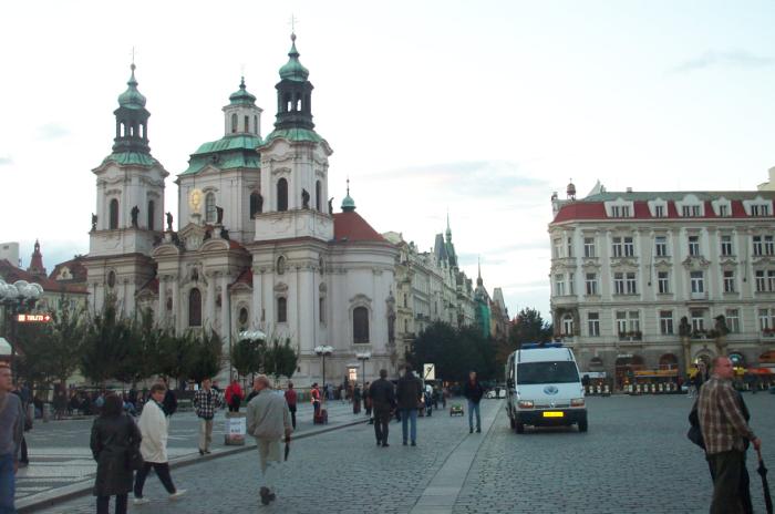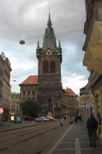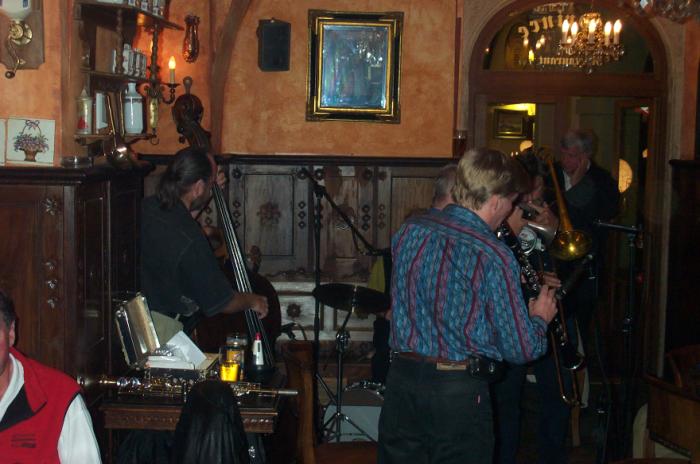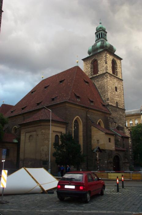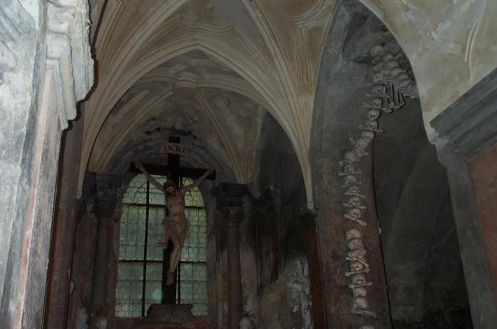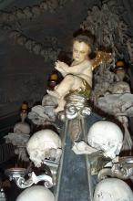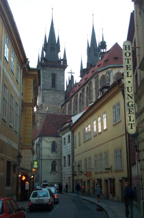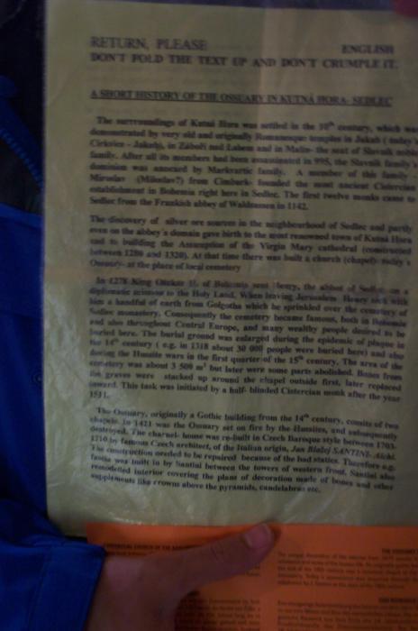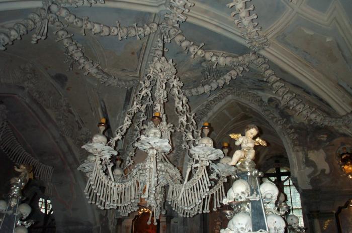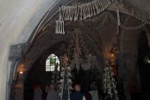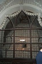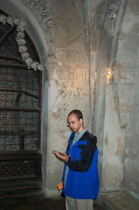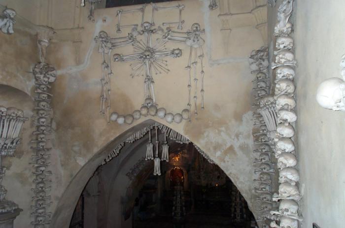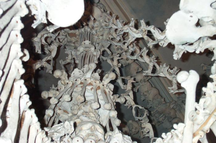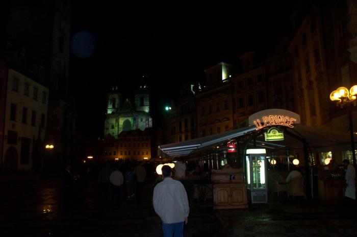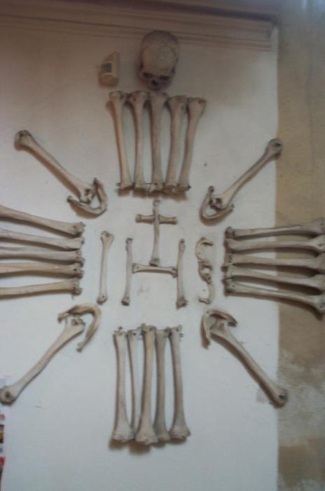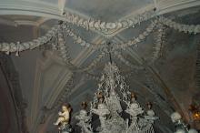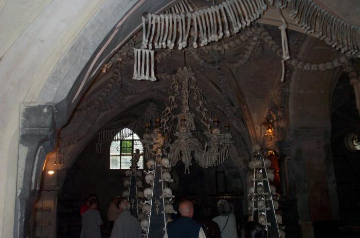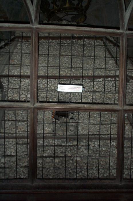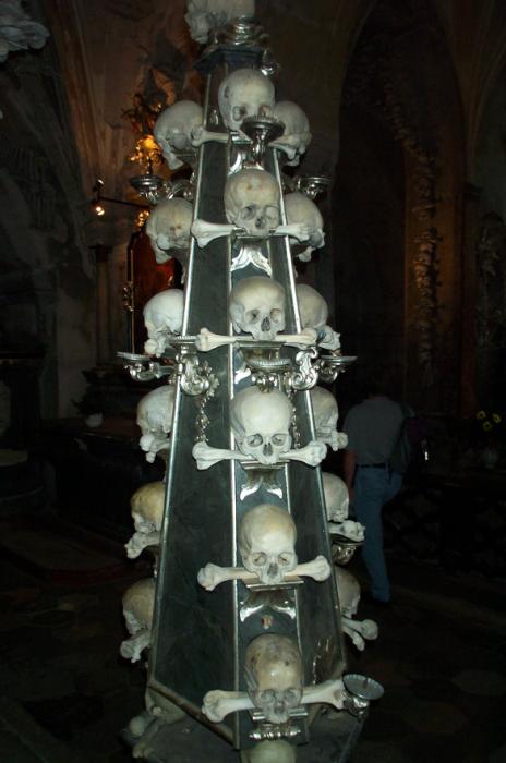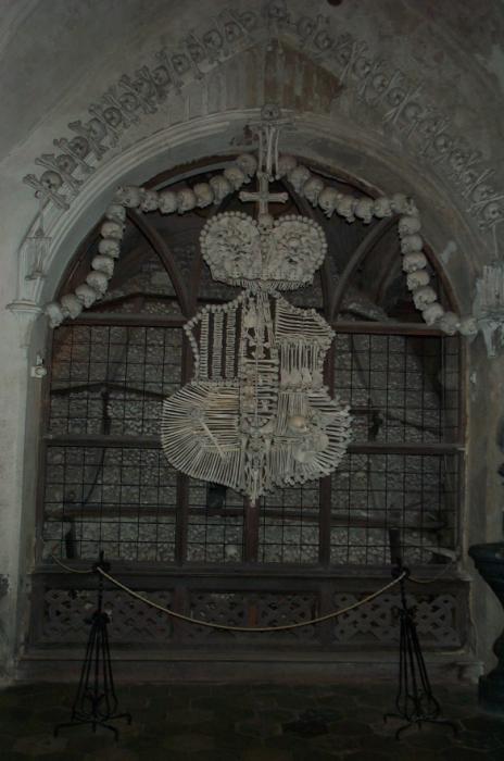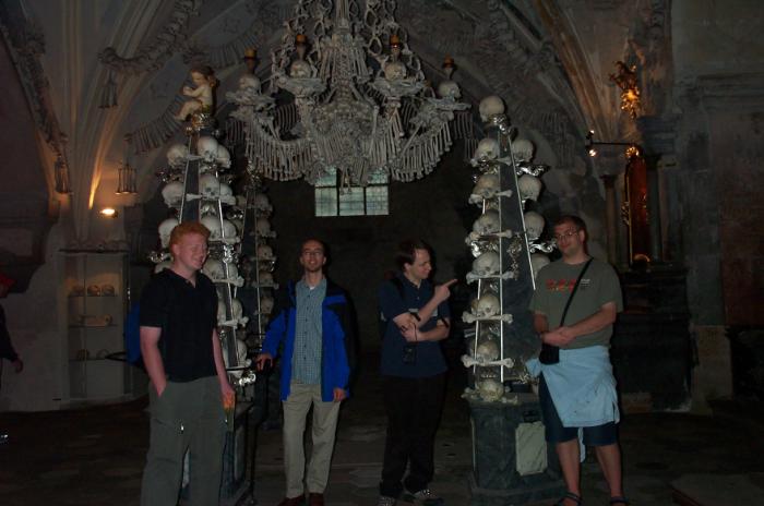 Sat 8-Sep-2001 Woke up, did the usual thing. The weather was rainy in the morning, so we decided to take a day trip to a small town called Kutnà Hora. Apparently at one time, Kutnà Hora was the most important town in Central Bohemia; it w'as a huge silver mining city in the 15th century. But our main attraction was in a suburb called Sedlec; specifically the Ossuary Chapel of All Saints. Apparently, an a 12th century monk made a pilgrimage to Jerusalem and brought back some soil, and spread it on the ground. Because of this, many of the elites of the time wanted to be buried there. The cemetery quickly used up all of it's capacity. Enter the black death, and the bodies quickly piled up in stacks in the abbey floor. Then a few centuries later, a "artist" takes all of the decomposed skeletons and decorates the abbey by creating chandeliers, pillars, and a coat of arms of the local lord - all with human bones. Afterwards, we checked a nearby cathedral. Then we tried to go to downtown Kutnà Hora to get some food, but we underestimated the distance involved so we ended up just taking a long walk. We then split up when we got back to Prague; Corey and I got food at a place called the "Mona Lisa" while the others went to an internet cafe. We met up at another restaurant called "U Prince". Since I already ate, I just got desert. We also got to watch live jazz. Afterwards, I went to an internet cafe where I email-ed home, and then it was back to the hostel.