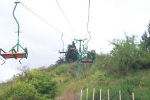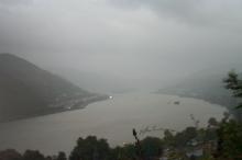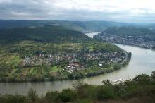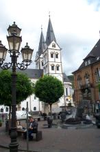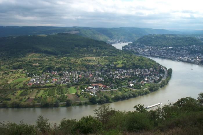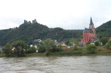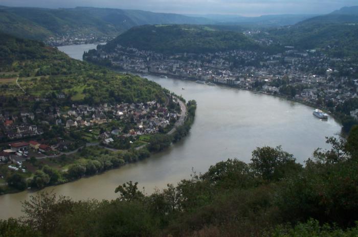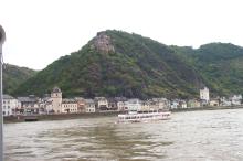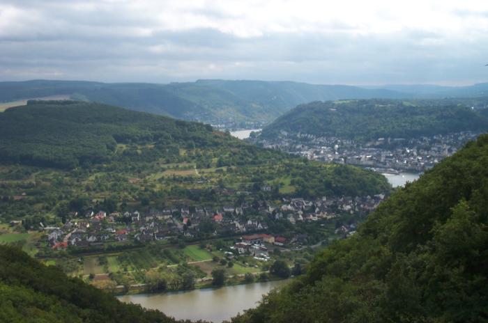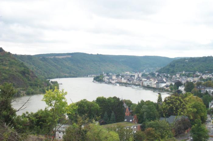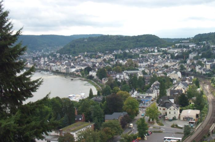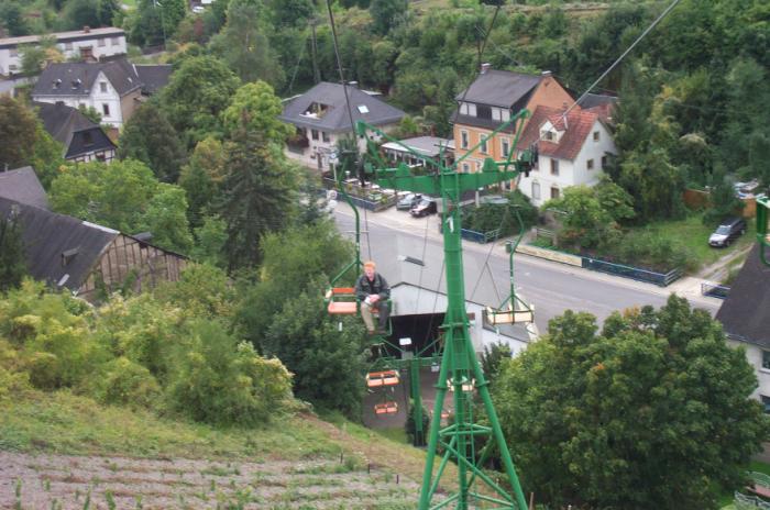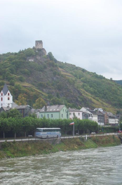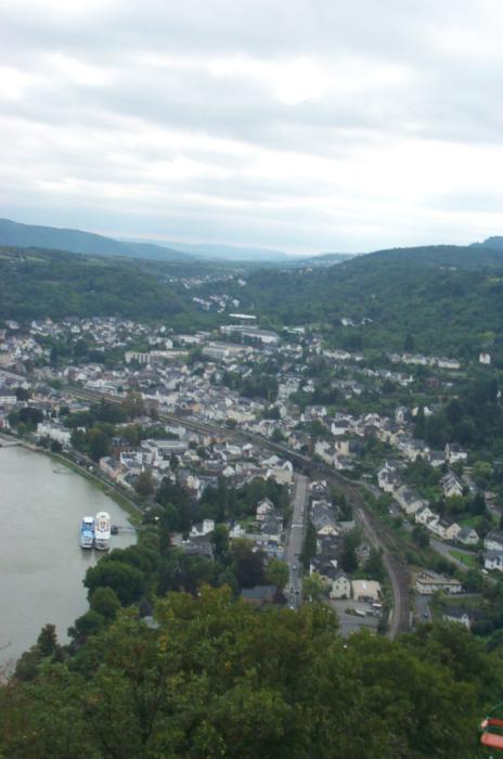 Wed 19-Sep-2001 Got up and collected my laundry. Erik was sick, so he stayed in all day. The others and I went down to the docks and got tickets for a round trip cruise to Koblenz, even though we wouldn't go the entire way. Unfortunately, the kiddies were getting on the same boat. Arg. We got some food on the ship and disembarked at Boppard. Boppard has a chairlift that takes you to the top of a huge hill overlooking what is described as "the bendiest bend of the Rhine". Again needless to say, I took many photographs. We also got sausage, wine, and ice cream at a small restaurant up there. We had time to kill, so we spent a few hours just hanging around in Boppard before heading back. On the cruise back, I noticed some interesting things about the Rhine right now. It is a very fast moving river, and I believe that it is very high right now. We passed several islands where either end would be submerged; trees would be poking out of the water but their trunks would be underwater. This makes sense given the lousy weather that we have been having the last two weeks. When we got back to Bacharach, Chris was set on hunting down this one restaurant he saw that served saurbraten. We found a place that served it, not sure if it was the same place. Since I have been pigging out all day, I just ordered the Hungarian goulash soup; pretty good stuff. Corey left dinner early so he could do his laundry. Chris and I got back to the hostel around 8pm and we goofed off for the rest of the evening; played chess against Erik a few times etc.