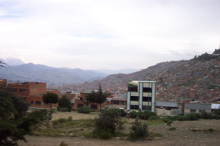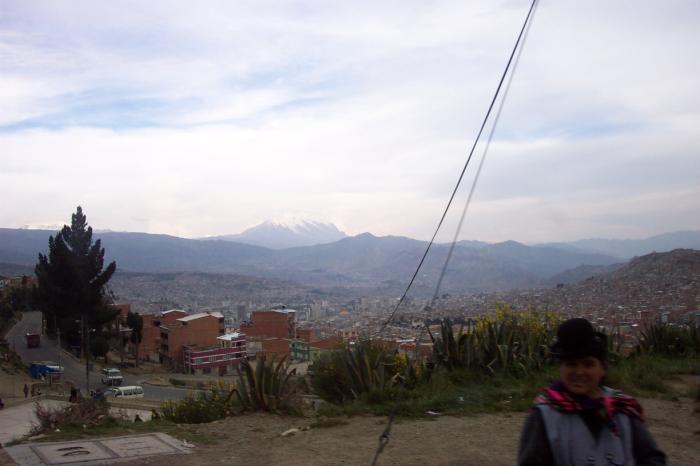 3-Jan-2003 - Arrived in La Paz on time. What people say about the decent into La Paz is true; the sight is one hell of a drama. The first sight of land is when you first see the bleak mountains fade in, with the occasional dirt road. Then the plane flies over the suburb of El Alto. Seeing El Alto is what finally told me that I was in South America; it had the same grid that I was used to; but with a very brown hue; with the exception of a few throughfares, none of the roads nor parking lots were paved. The plane turned around and I caught a glimpse of the canyon where La Paz proper resides (unlike the USA, the poor parts of the city were high and the rich sections are lower).