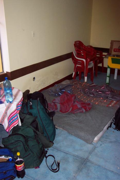 After deciding on these plans, we paid for our room, got dinner at "La Nimbo", which had seats lined with alpaca skins. It was also the first time that I had banana on pizza. Apparently, the proprietor for a while thought we were Brazillian; in his attempt to verify that he did an amusing Capoeira impression. I almost never pass off as anything other than pureblood USA, but Pradip being south Indian, could very well pass off as being Afro-Brazillian. After the meal was done, we got some sleep.