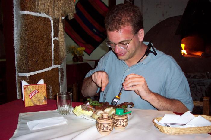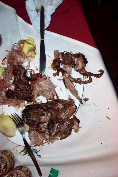 I checked out the cuy al horno again, and this time it was fifty nuevos soles (or fifteen bucks) which is obcene by Peruvian standards. Regardless, I ended up trying it. When it came, it looked like a roasted road kill. It is supposed to be eaten by hand and no, I didn't try to bite its head off. The first bite that I made got a piece of skin, and I gagged. Once I figured it out, it seemed to taste like chicken with what I could only describe as a saltwater flavor. After trying some, Corey said that it tasted like squirrel. While I thought that the meat itself was ok, this paticular meal violated by insistance that a meal not require work (and thus, free of bones and other inedibles). Because of that, I believed that I left more meat on the remains than I was supposed to. After that, we all went to sleep early.