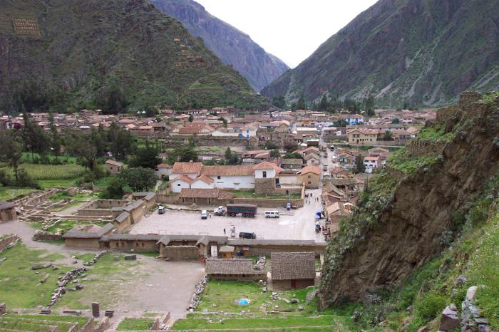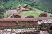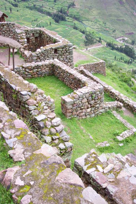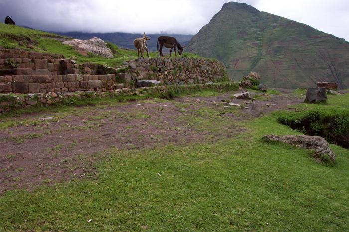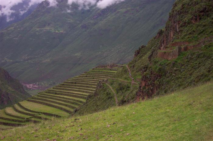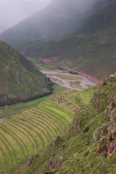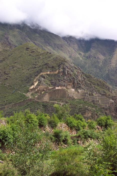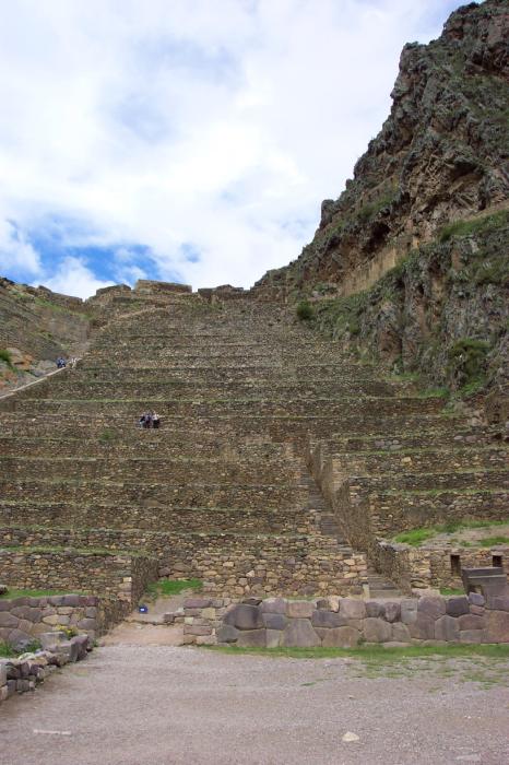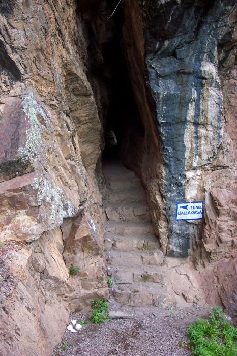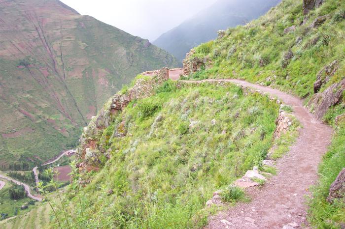 The hike itself was quite pleasent. The Pisac ruins are a set of fortifications built on the sides of cliffs, a temple, and some residential areas. The trails themselves were built by the Incas, which was quite impressive. At one point, there is a tunnel going through solid rock. Apparently, the Incas were able to find a fissure and enlarge it, creating the tunnel. As I walked along the trail and along the forifications, I wondered how any competant army that manned these positions could possibly get dislodged. The constructions themselves were easily the equal of anything one might see in Europe, but the locations would often be at the top of fifty foot cliffs. Apparently, the Incas abandoned Pisac during their flight from Cusco, to get a temporary victory at Ollantaytambo and get defeated again. Ollantaytambo did not look like an easy nut to crack, but it seemed like nothing compared to the Pisac fortifications.