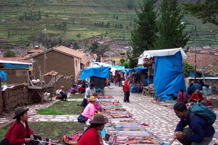 We got to Pisac and started browsing the market. The market had two parts: a somewhat traditional farmer's market, and a kitchy souvenir market for tourists. In the souvenir part, the various vendors had much of the same pushiness that I've seen in Cusco itself. Eventually, we settled on buying from one particular vendor precisely because they wern't being excessively pushy. I bought a picture and an amusing chess set where the white pieces were Spaniards, and the black pieces were Incas.