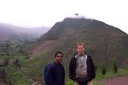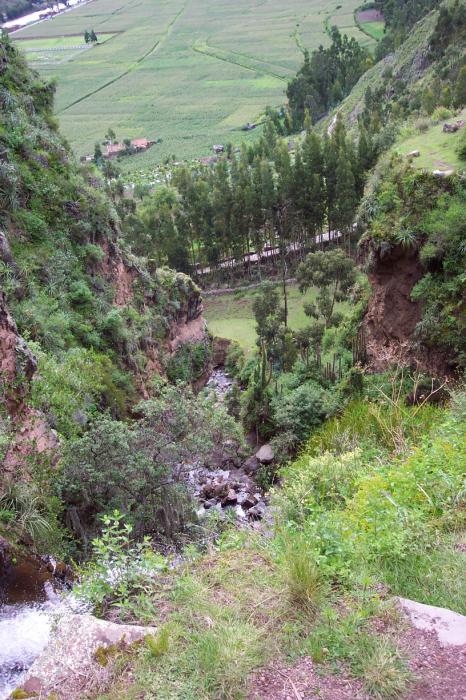 As we got closer to Pisac itself on the hike, we did not get any lower. At one point, I found a place where I thought the trail went down but it just went into a muddy cliff. Continuing on past that, it was disturbing that we were not decending. At one view of Pisac, I was standing up and my head was at 12 o'clock and my feet were at 6, Pisac was at 7. We eventually got to a set of winding trails that allowed us to descend and enter Pisac itself. On the way, there was a local offering freshly squeezed orange juice. It really hit the spot.